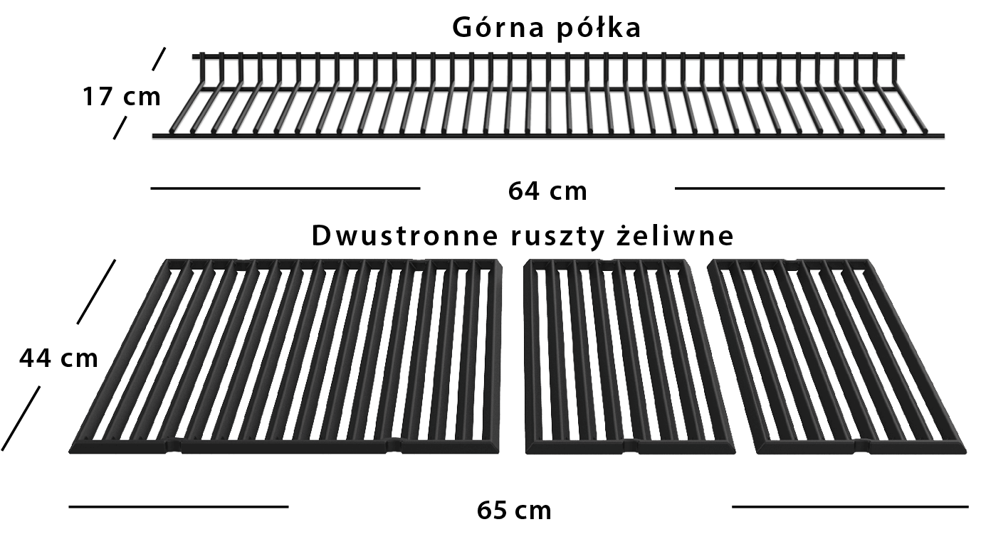 - Górny ruszt wykonany z prętów ze stali szlachetnej z tylną ścianką zapobiegającą spadaniu potraw o wymiarze 64 x 17 cm