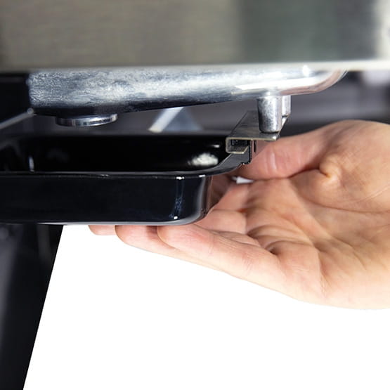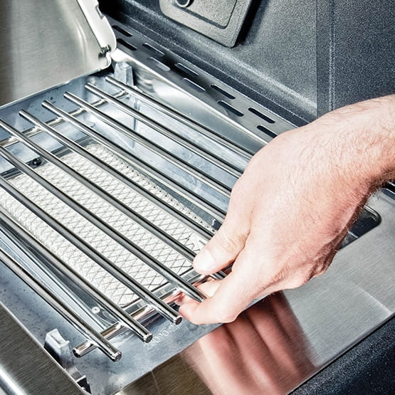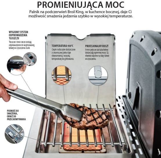- Palnik na podczerwień nagrzewa się do ponad 800 stopni a dzięki rusztowi wykonanego z prętów ze stali szlachetnej uzyskujemy charakterystyczny wzór na mięsie. Wysokość rusztu jest regulowana natomiast pod palnikiem jest tacka ociekowa na tłuszcz.